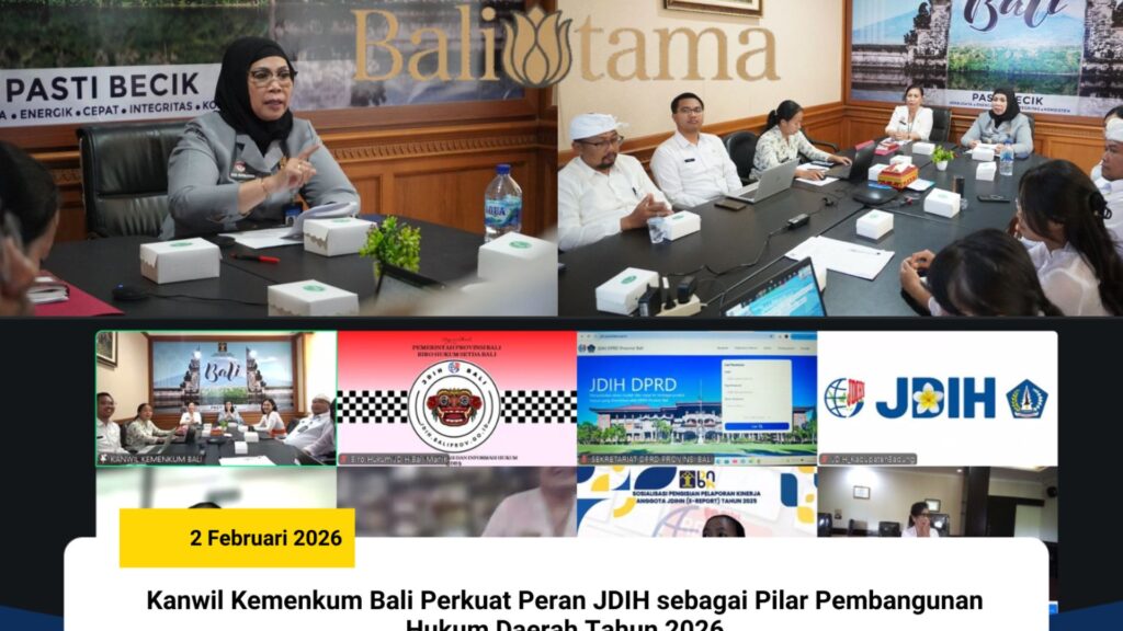 Kantor Wilayah Kementerian Hukum Bali terus memperkuat peran Jaringan Dokumentasi dan Informasi Hukum (JDIH) sebagai instrumen strategis dalam mendukung pembangunan hukum nasional dan daerah pada tahun 2026. Komitmen tersebut ditegaskan melalui kegiatan Pembinaan dan Pengembangan Anggota JDIH di Wilayah Provinsi Bali Tahun 2026 yang diselenggarakan secara virtual pada Senin, 2 Februari 2026.